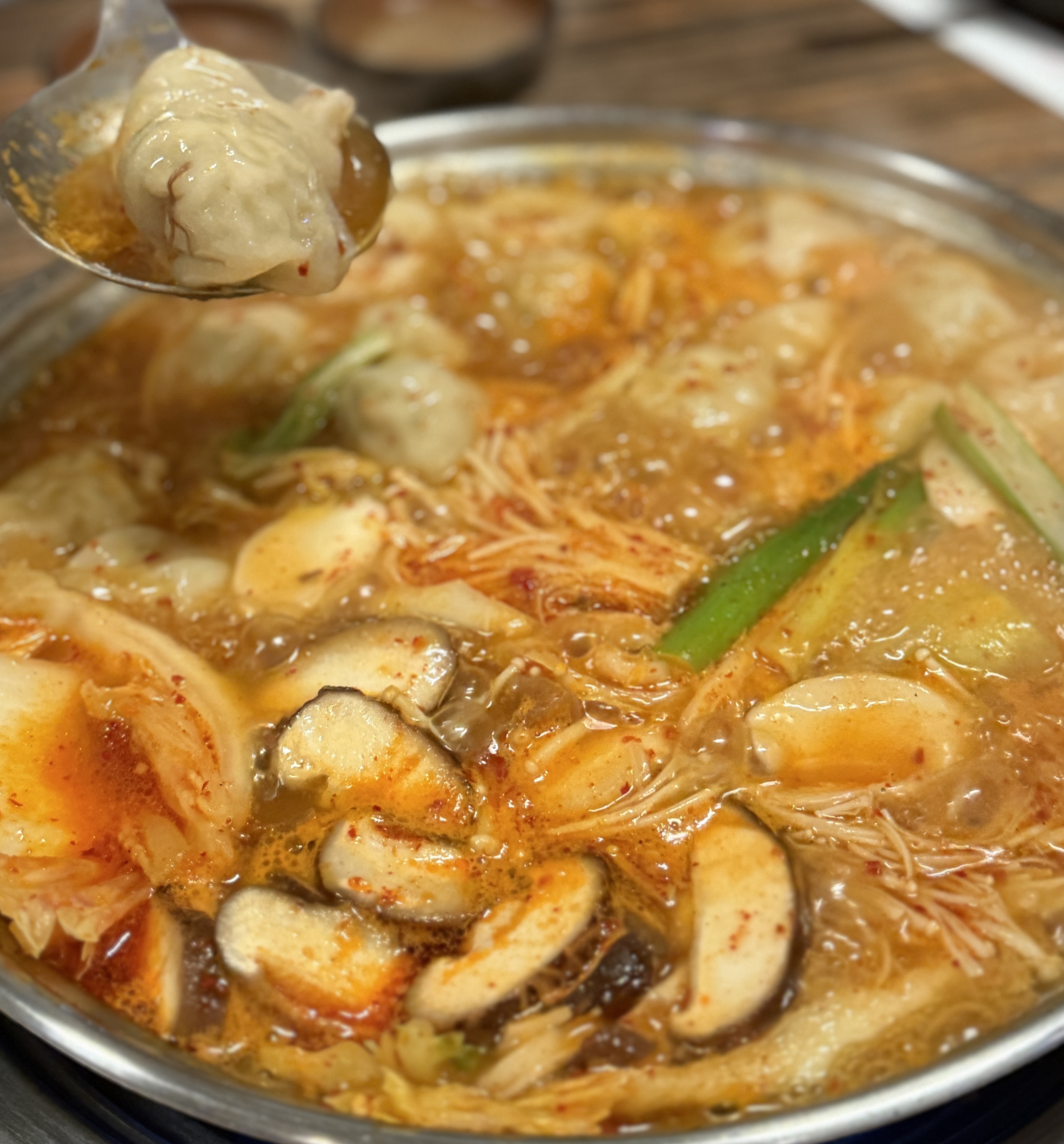 얼큰 만두 전골은 칼칼하고 맛있어요.